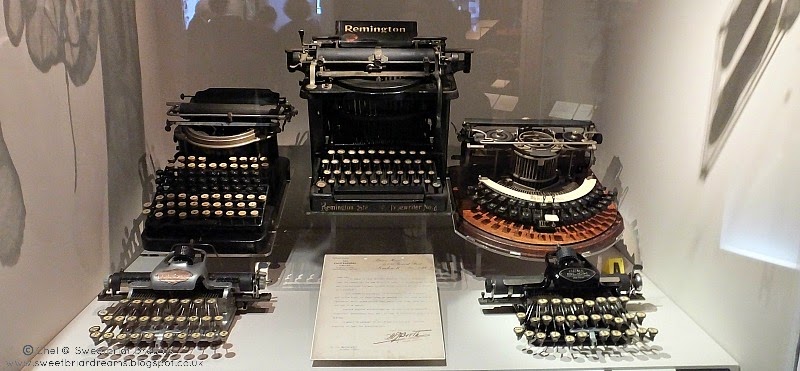 This exhibit was great to see, especially as I tap out my post on the gentle keyboard of my laptop. Can you remember using typewriters similar to these with the faint 'p' and 'q' every time you plunged your little finger down on them (I'm talking to touch typers here). The soreness of your fingers when you missed the keys and got caught between two, and then if you typed too fast untangling the letter arms - how I miss those days!